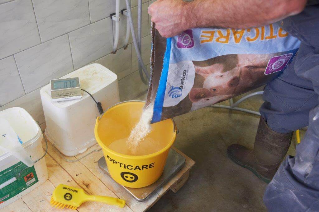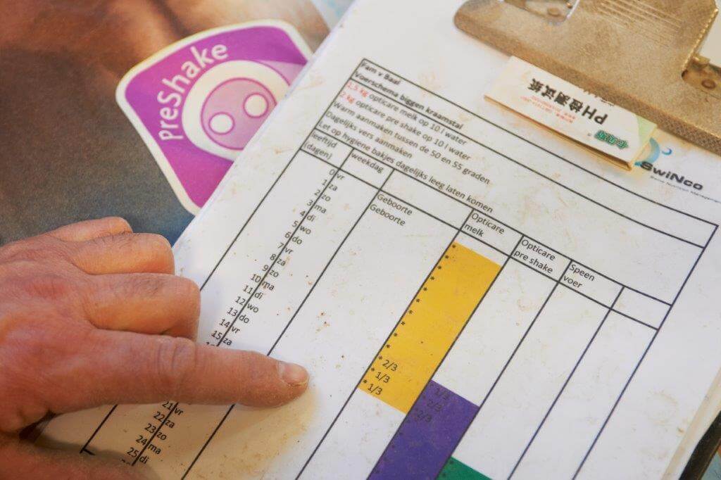 "Wil je biggen leren dat er wat anders is dan zeugenmelk, begin dan met melk bijvoeren", zegt Robert van Baal. Hij heeft prima ervaringen met handmatig melk bijvoeren. Omdat het te veel arbeid kost heeft hij nu een installatie met melkcups. Tegelijk paste hij de voerstrategie in het kraamhok aan, waardoor de biggen nu geleidelijk worden gespeend. Ze starten met melk, gaan over naar vloeibare préstarter en krijgen daarnaast ook melkkorrel. De laatste week na spenen, vreten ze dan al lekker speenvoer. Na spenen gaan daardoor alle biggen gemakkelijk aan het vreten